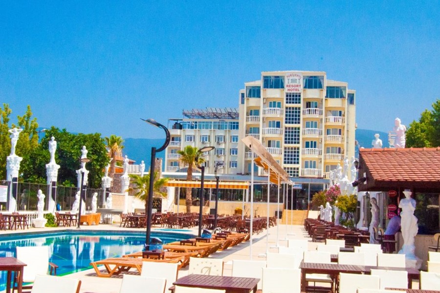 Agrigento Hotel Resort, Erdek Koyu’nda denize sıfır konumda yer alır ve 300 yatak kapasitesi ile konforlu bir konaklama sunar. Odalarda klima, televizyon, minibar ve emanet kasası gibi olanaklar bulunur. Yarım pansiyon hizmeti veren otel, misafirlerine keyifli bir tatil deneyimi sağlamaktadır.
